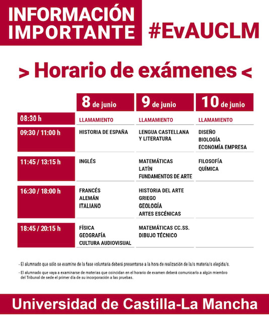 Se acerca la Evaluación para el Acceso a la Universidad y de cara a que estéis lo mejor informados posibles, adjuntamos el calendario oficial que nos ha llegado desde la Universidad de Castilla-La Mancha.