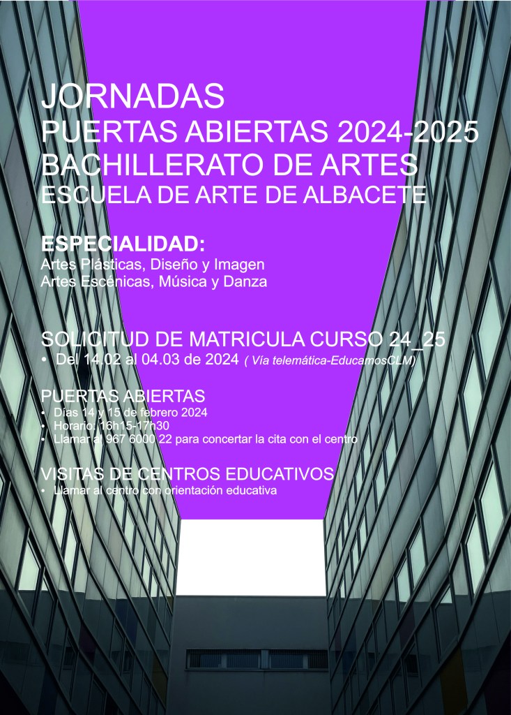 Se ha abierto la convocatoria de admisión de alumnado para el curso 2024/2025 para el Bachillerato de Artes en sus especialidades de Artes Plásticas, imagen y diseño y Música y Artes Escénicas.