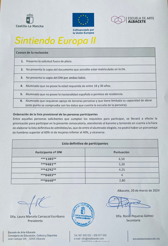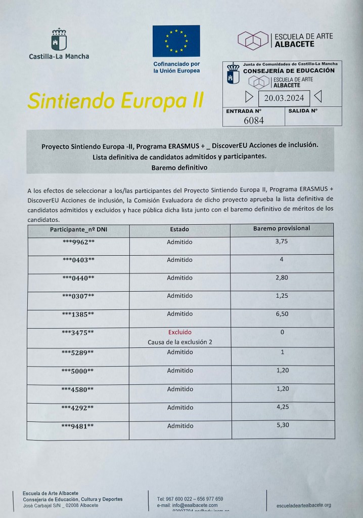 Lista definitiva de candidatos admitidos y participantes. Proyecto Sintiendo Europa -II. Publicado el marzo 20, 2024 por escuelalbacete Comparte esto: Haz clic para compartir en X (Se abre en una ventana nueva) X Haz clic para compartir en Facebook (Se abre en una ventana nueva) Facebook Relacionado