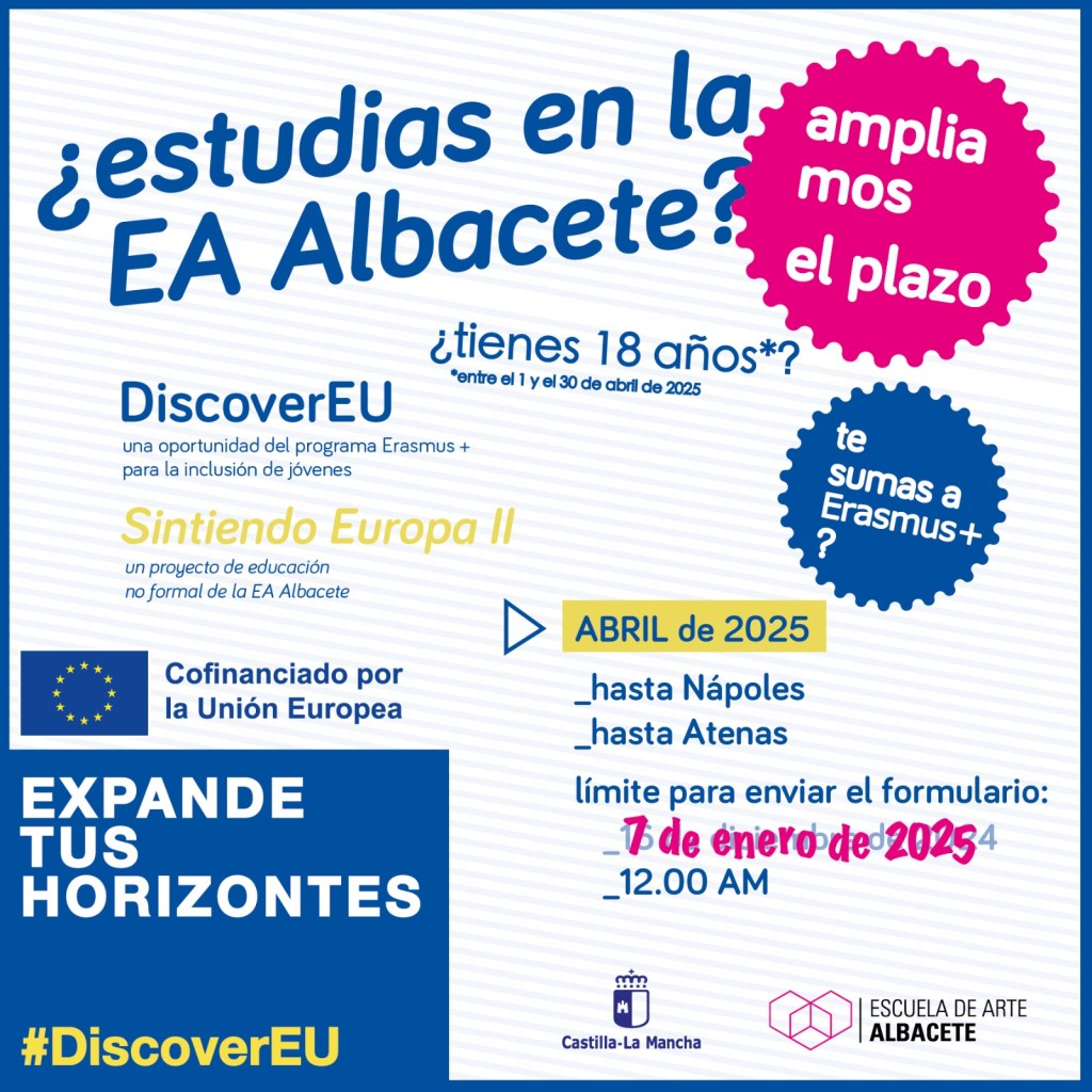 Las presentes bases regulan la forma de acceso del alumnado de la Escuela de Arte Albacete al Programa ERASMUS + KA155-YOU – Acción de inclusión de DiscoverEU Convocatoria 2023 Ronda 2 KA1, titulado Sintiendo Europa II y concedido a esta entidad por la AGENCIA NACIONAL ESPAÑOLA DE LA JUVENTUD (INJUVE) (Spanish National Agency for Youth).