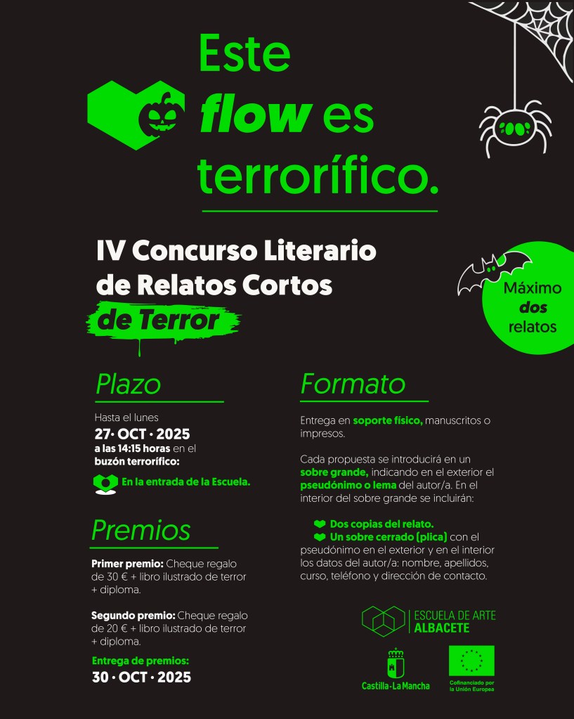 Con motivo de la celebración de Halloween, la Escuela de Arte de Albacete convoca el IV Concurso Literario de Relatos Cortos de Terror. Se buscan relatos inquietantes, perturbadores, macabros o sobrenaturales, capaces de provocar miedo, tensión o desasosiego en el lector.
