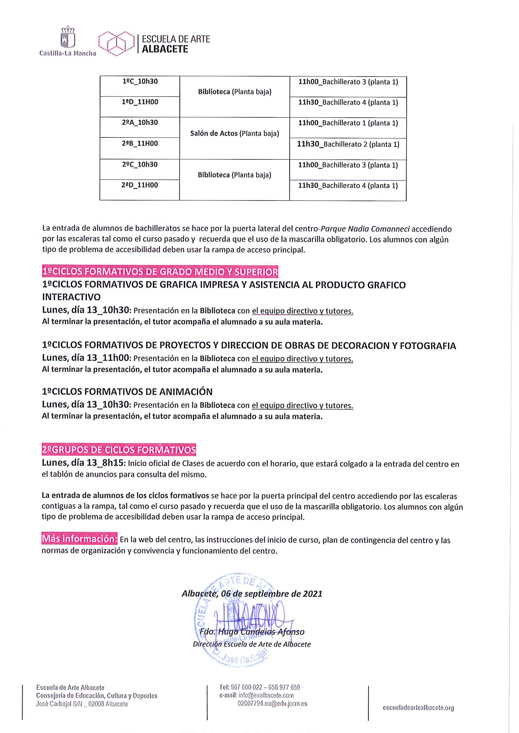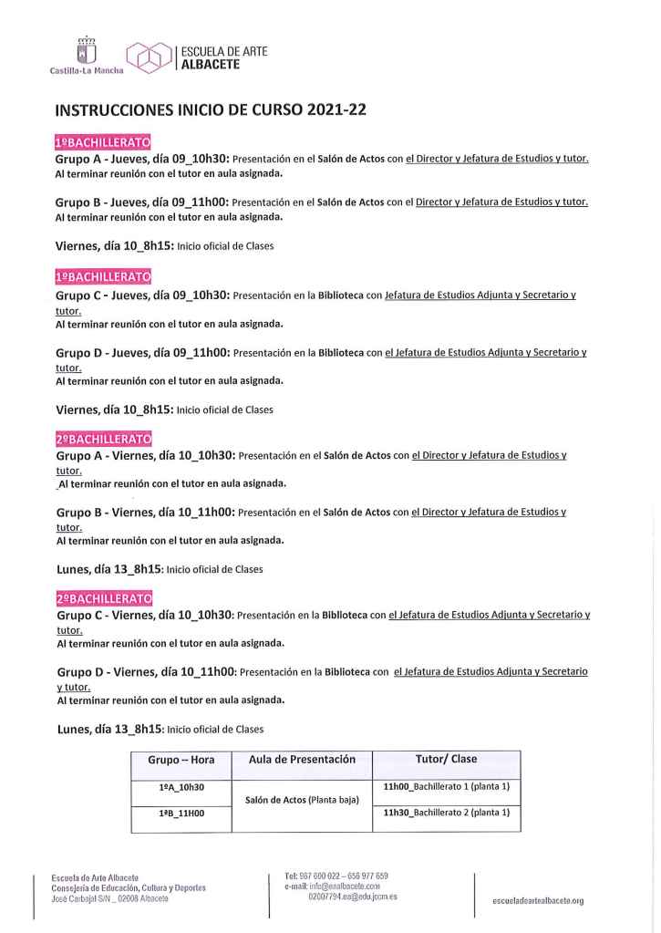 Inicio de las clases del curso 2021/2022. Bachilleratos y Ciclos Formativos NOTA: Los alumnos deben consultar en la página EducamosCLM para ver su grupo en el encabezado de su perfil. Comparte esto: Haz clic para compartir en X (Se abre en una ventana nueva) X Haz clic para compartir en Facebook (Se abre en una ventana nueva) Facebook