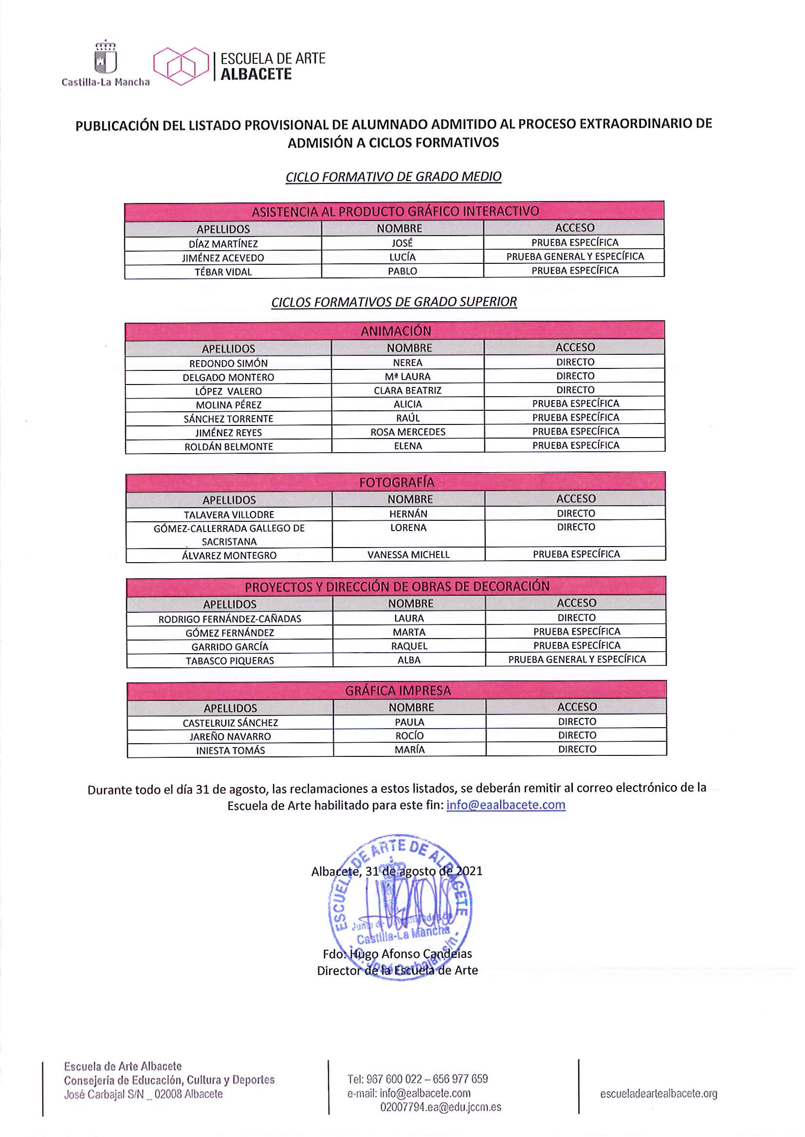 PUBLICACIÓN DEL LISTADO PROVISIONAL DE ALUMNADO ADMITIDO AL PROCESO EXTRAORDINARIO DE ADMISIÓN A CICLOS FORMATIVOS Comparte esto: Compartir en X (Se abre en una ventana nueva) X Comparte en Facebook (Se abre en una ventana nueva) Facebook